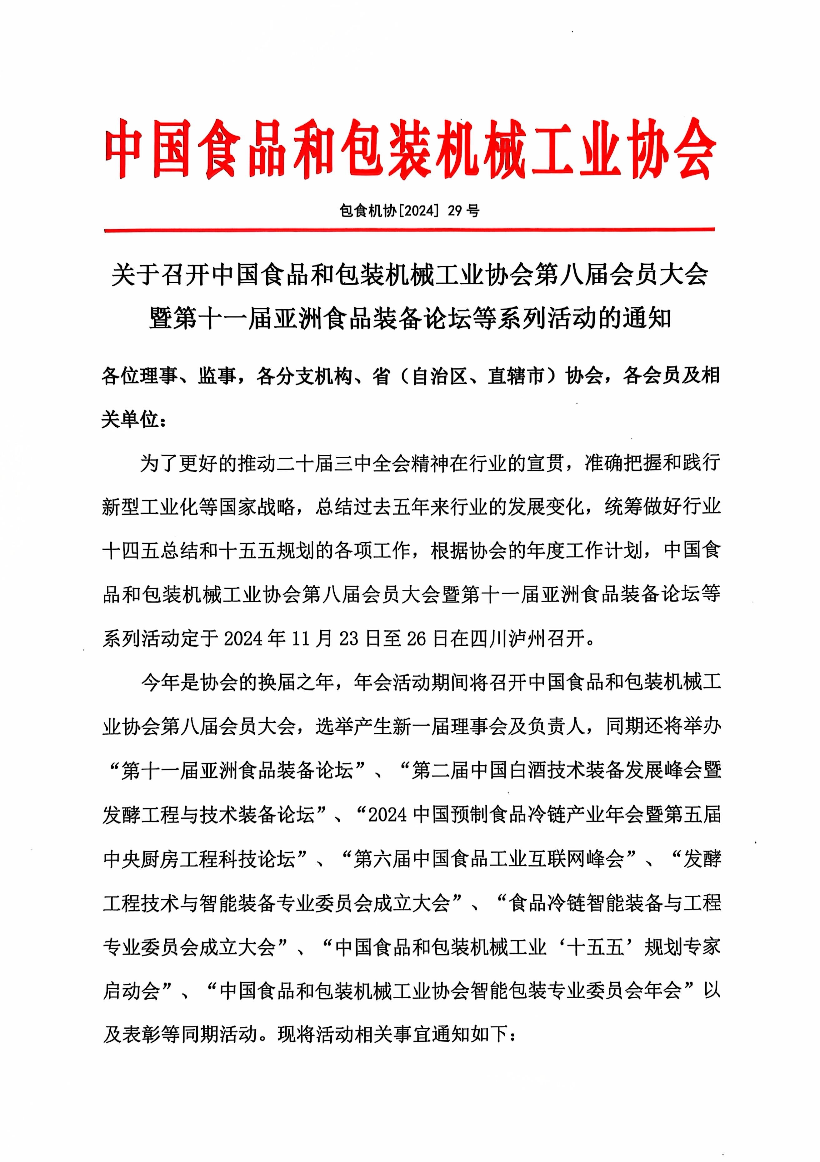 關于召開中國食品和包裝機械工業協會第八屆會員大會暨第十一屆亞洲食品裝備論壇等系列活動的通知